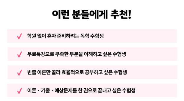 - 문제은행 완벽 반영: 반복해서 출제되는 유형을 모의고사 형태로 제공하여, 문제를 푸는 것만으로도 자연스럽게 이론이 암기되는 효과를 누릴 수 있습니다.
